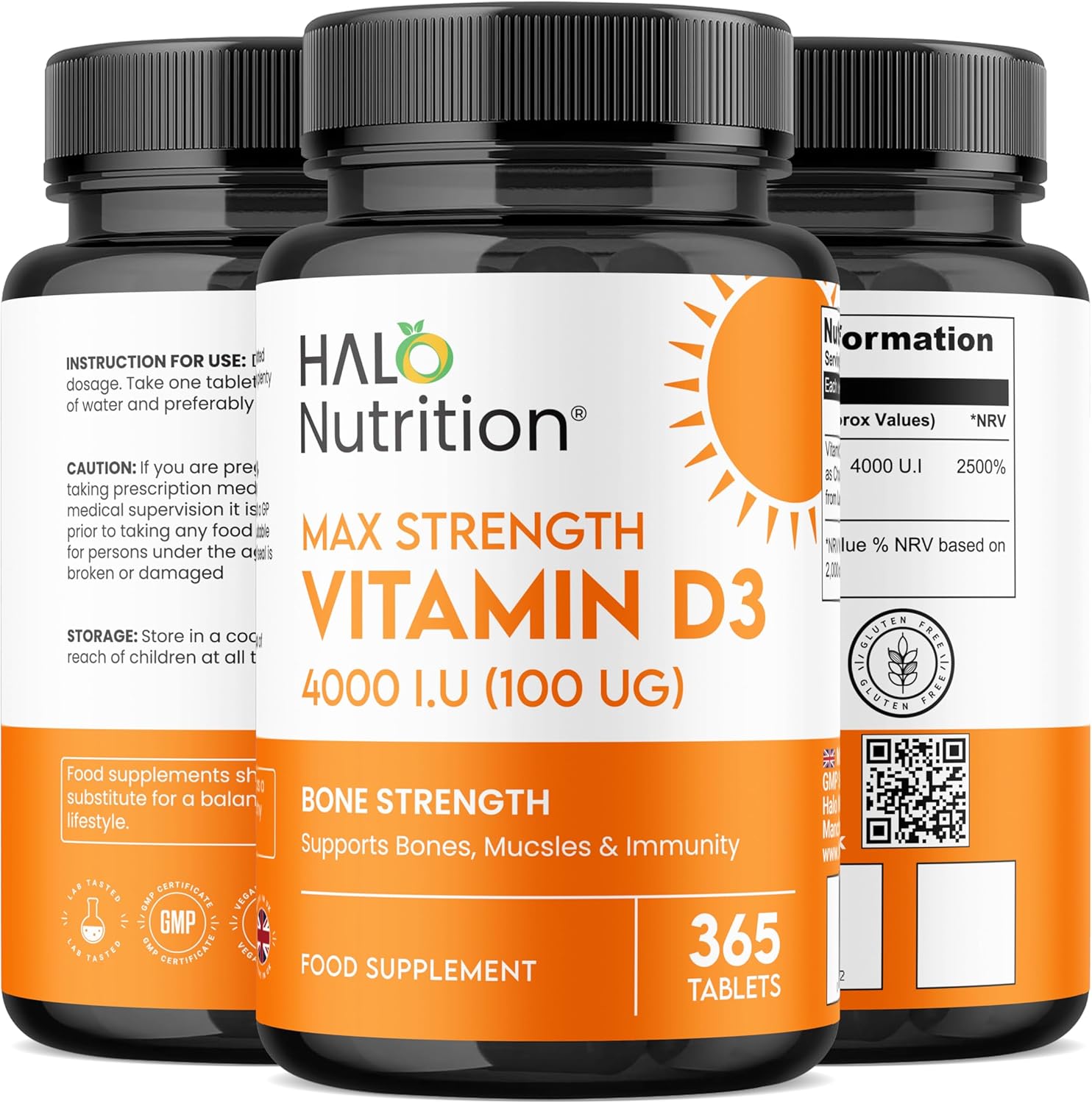 Halo Nutrition Vitamin D3 provides a potent 4000 IU of vitamin D3 (cholecalciferol) per tablet in a convenient one-a-day format. This high-strength formula is designed to support daily vitamin D intake, particularly during periods of low sunlight exposure.